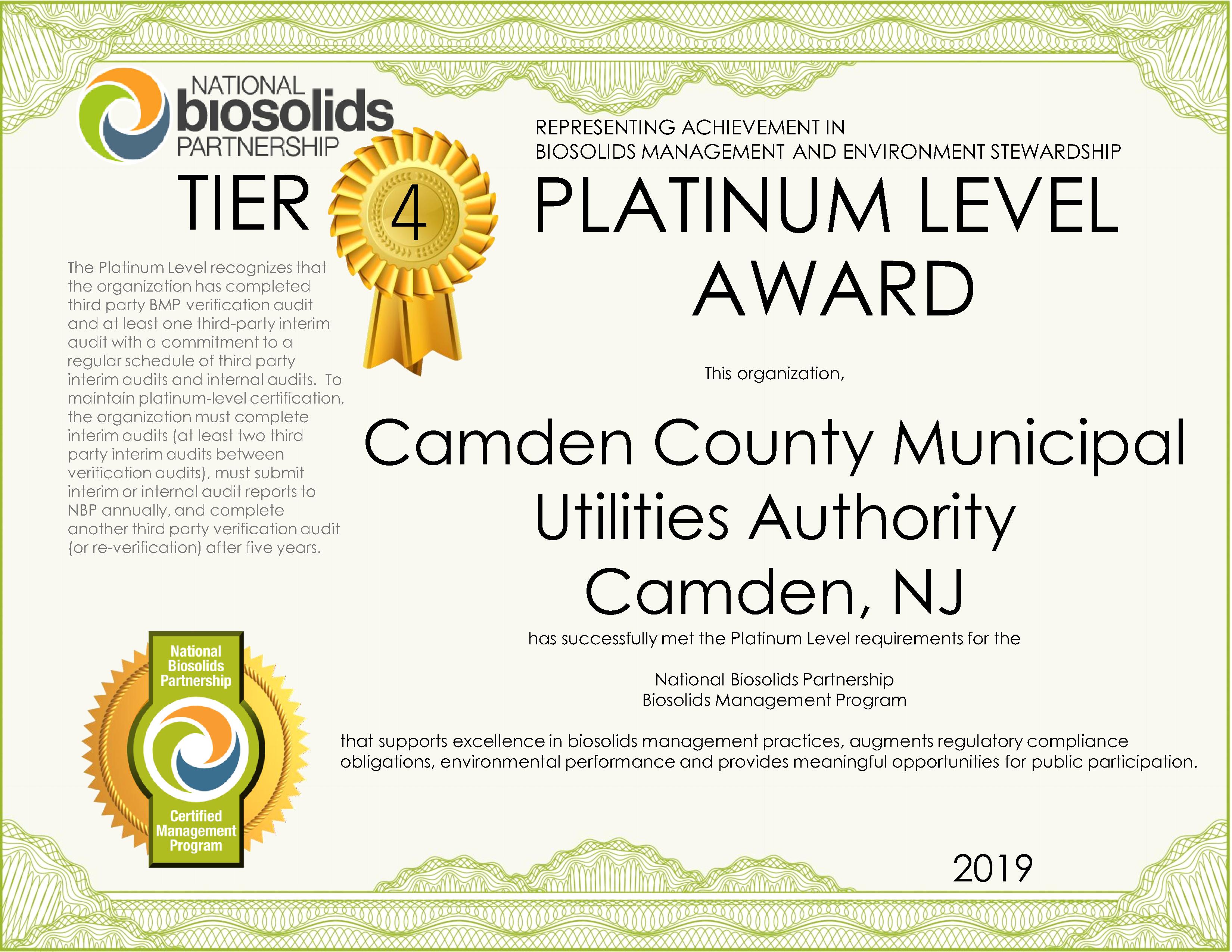 In 2010, the CCMUA became a National Biosolids Partnership (NPB) Certified Environmental Management System Agency in recognition of its commitment to environmental performance and community service. Certification from the National Biosolids Partnership””a joint venture between the United States Environmental Protection Agency, National Association of Clean Water Agencies, and the Water Environment Federation“”is a tremendous honor for water and wastewater utilities. At the time of its certification, the CCMUA was the first water or wastewater utility in the State of New Jersey”“and only the 31st agency, out of over 14,000 utilities”“to receive this prestigious national honor. The CCMUA has since been certified at the Platinum (highest) level.
